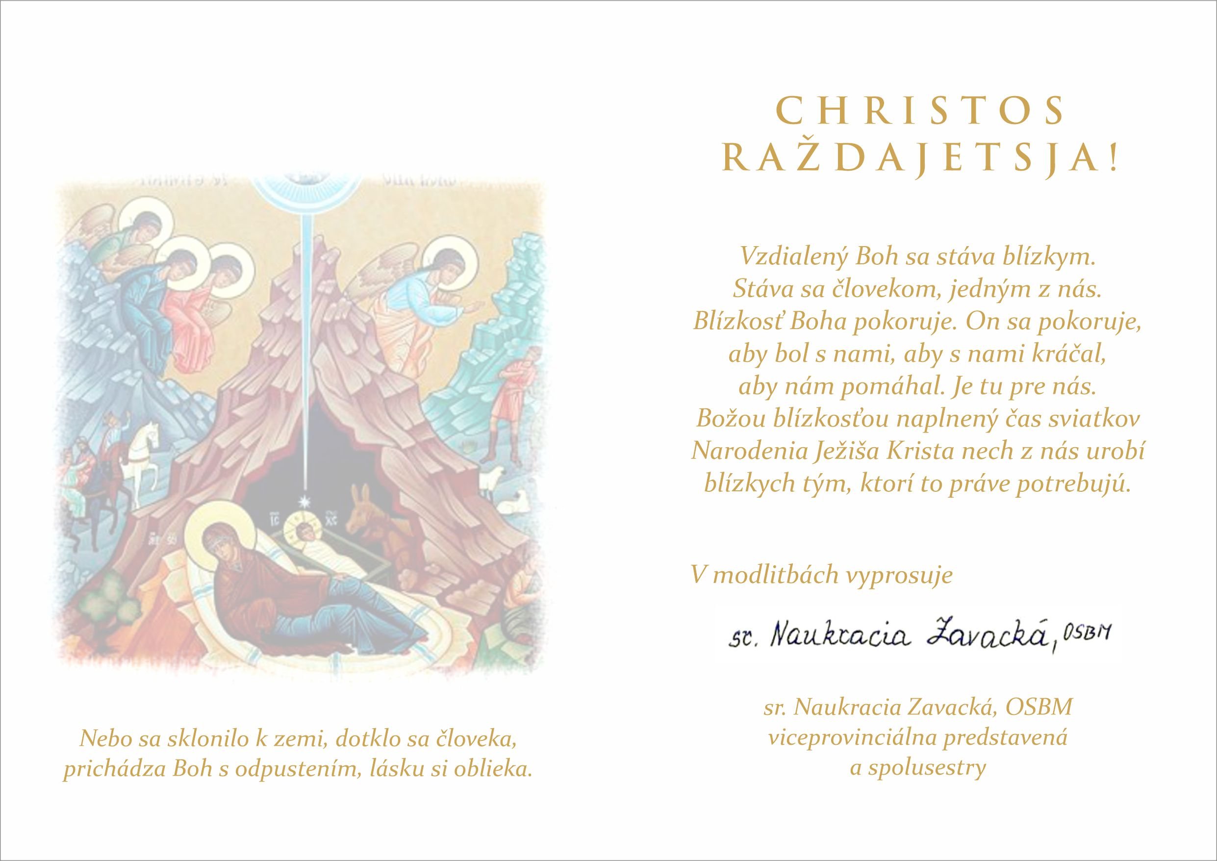Vzdialený Boh sa stáva blízkym. Stáva sa človekom, jedným z nás. Blízkosť Boha pokoruje. On sa pokoruje, aby bol s nami, aby s nami kráčal, aby nám pomáhal. Je tu pre nás. Božou blízkosťou naplnený čas sviatkov Narodenia Ježiša Krista nech z nás urobí blízkych tým, ktorí to práve potrebujú.
